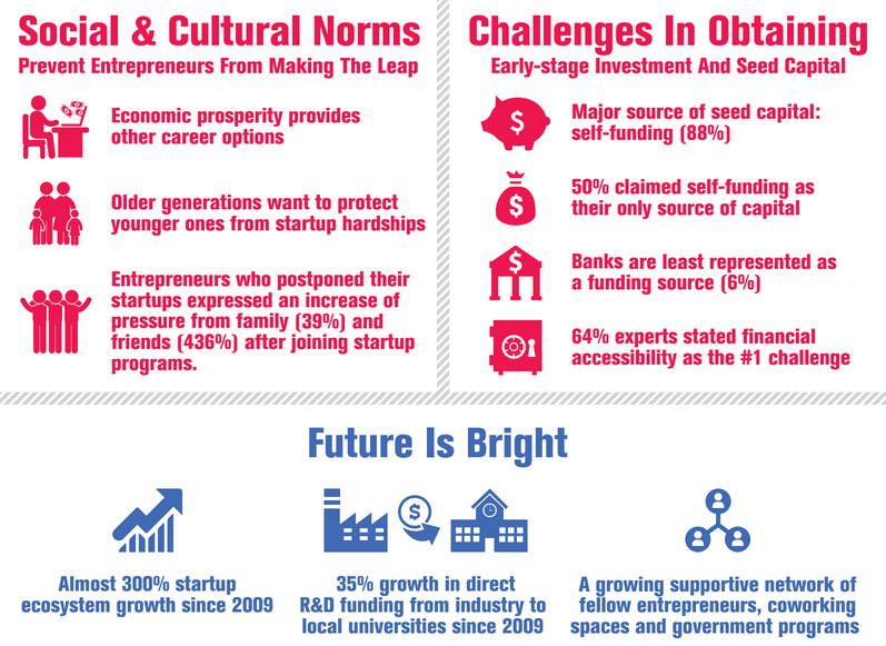 - Culture was cited as a big issue in cultivating the entrepreneurial spirit with many locals being highly risk-adverse. Surveyed entrepreneurs said they faced growing pressure from family and friends after enrolling in entrepreneurship programs.